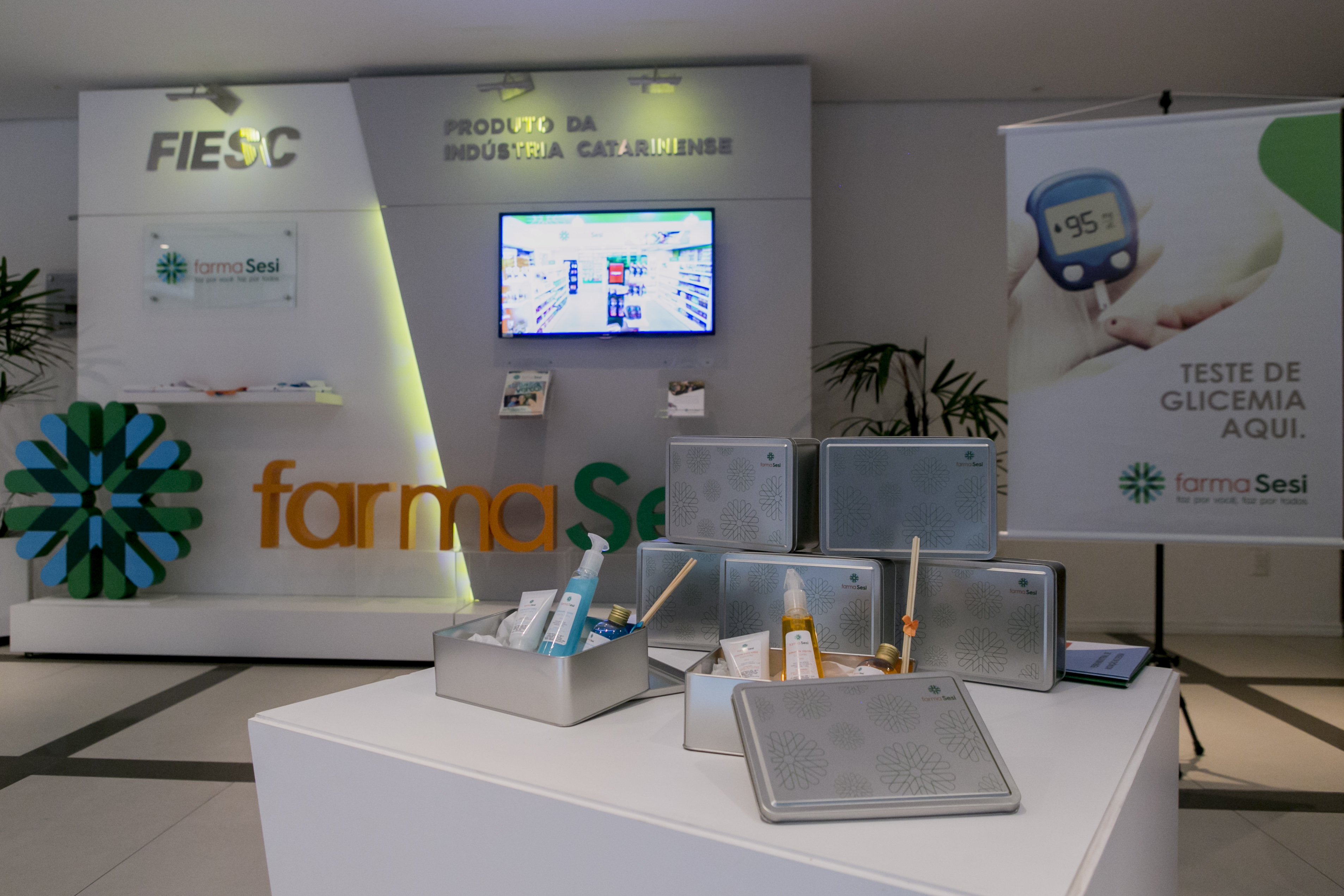 Florianópolis, 30.1.2018 – O SESI Santa Catarina, entidade da FIESC, participa do Espaço Indústria, ambiente localizado na sede da FIESC, em Florianópolis, que mostra, todos os meses, o trabalho de empresas e entidades do Estado. Em dezembro, o SESI lançou o processo de reposicionamento da sua rede de farmácias. “A nova marca farmaSesi e o slogan ‘Faz por Você, Faz por Todos’, traduzem o objetivo de melhorar a saúde das pessoas, implementando soluções que beneficiam a vida dos trabalhadores, consumidores e comunidade”, explica o superintendente do SESI/SC, Fabrizio Machado Pereira.